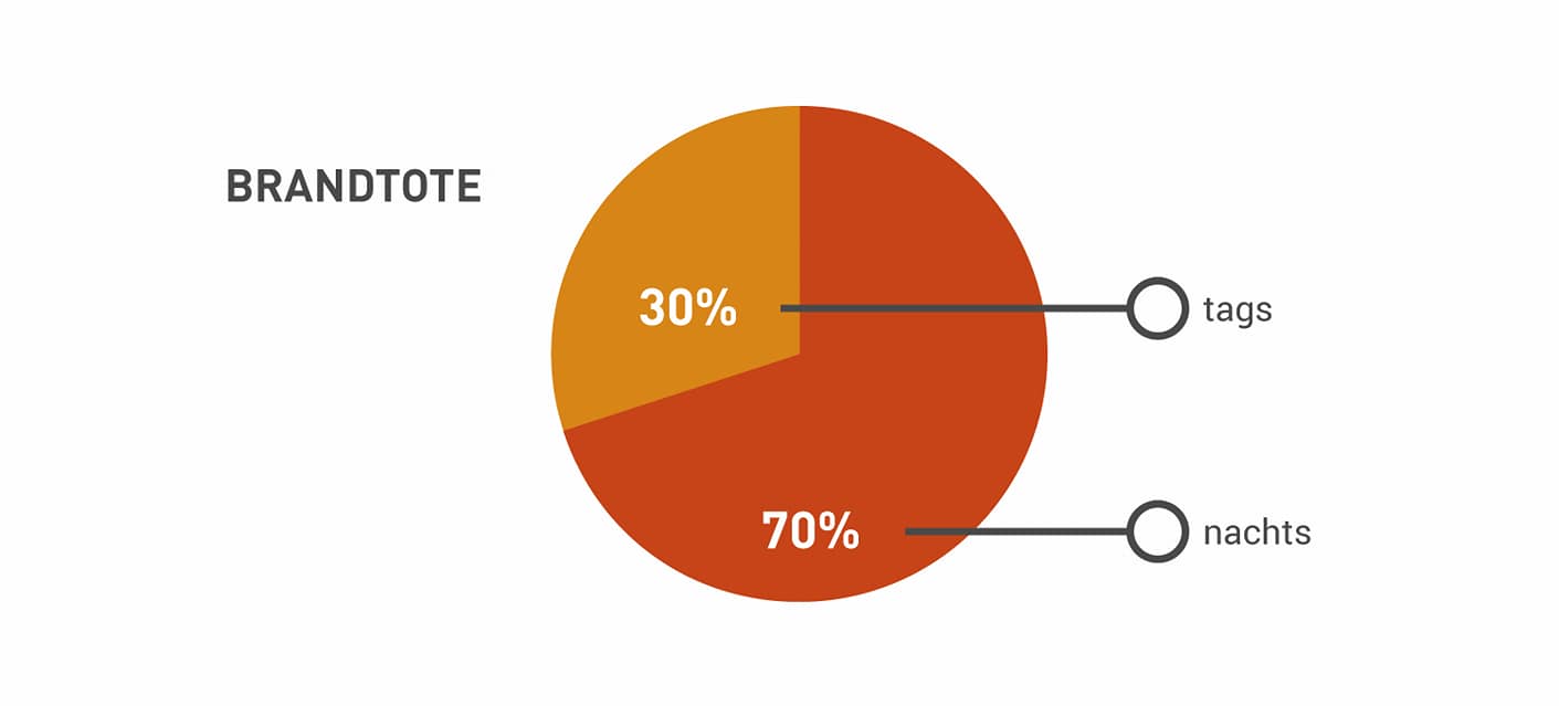 70% aller Brandopfer verunglücken nachts in den eigenen vier Wänden. Denn nachts schläft auch der Geruchssinn. Die gefährlichen Rauchgase werden dadurch nicht bemerkt und führen zum Tod durch Ersticken. Rauchmelder jedoch schlafen nie.